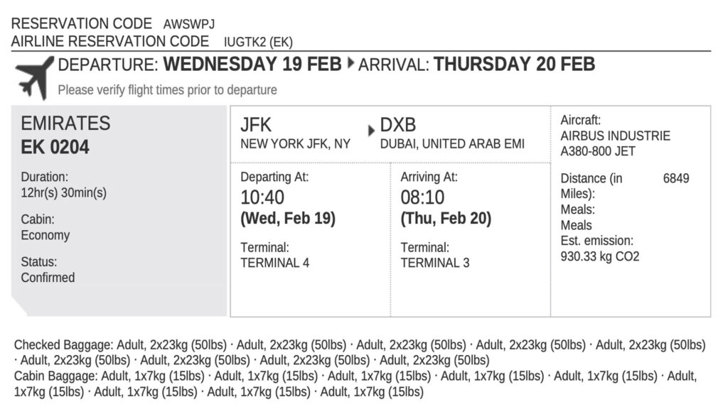 Dzień 1 i 2 (19-20 II): Nowy Jork – Dubaj (Zjednoczone Emiraty Arabskie).